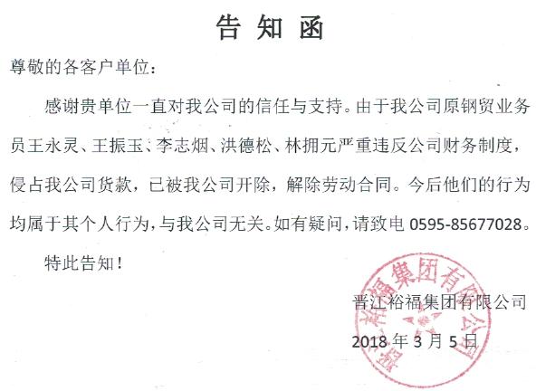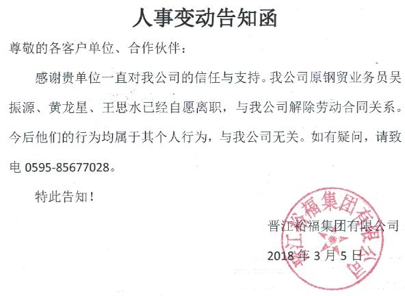 关于晋江裕福集团钢贸事业部——人事变动告知函